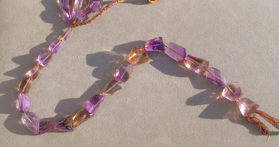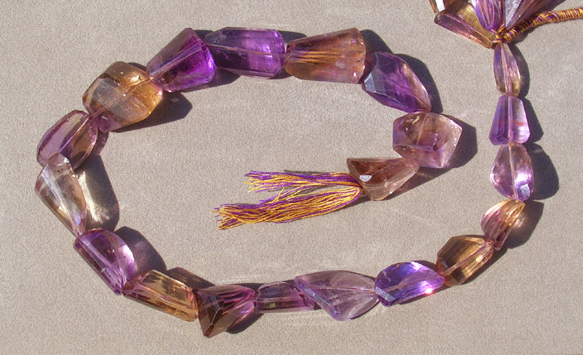 Ametrine faceted nugget beads. The first two photos were taken in bright morning sun. The third photo was taken in softer late afternoon sunlight. The seventh bead from the center is chipped but very usable.