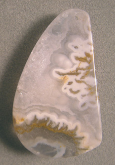 ![]() Gold and white bands of agate criss cross this freeform pendant bead. |