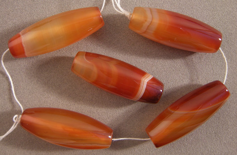 Carnelian agate barrel beads Catalog 5857 5 beads 38 x 15mm to 40 x 14mm 290 carats $24(SOLD) |