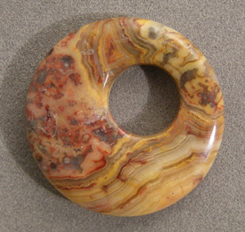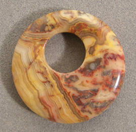 ![]() A smaller pendant type bead from red and yellow crazy lace agate. Off center hole in disc. |