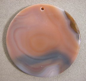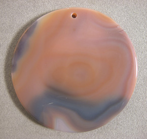 ![]() Large dark blue and plum colored disc pendant with other shades from Chinese agate. Named daybreak by the artist it reminds us of a turbulent sky at that time of day. |
