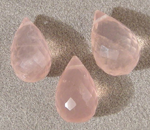 Rose quartz faceted briolettes Catalog 1074 3 beads 13.4 x 8.5mm to 14.1 x 9.3mm 17.9 carats $23(SOLD) |