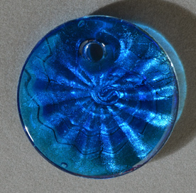 ![]() Round lampwork glass pendant bead with large 5mm beveled drill hole. Dark circle in photo Northeast of drill hole is only a magnified shadow of the drill hole. |