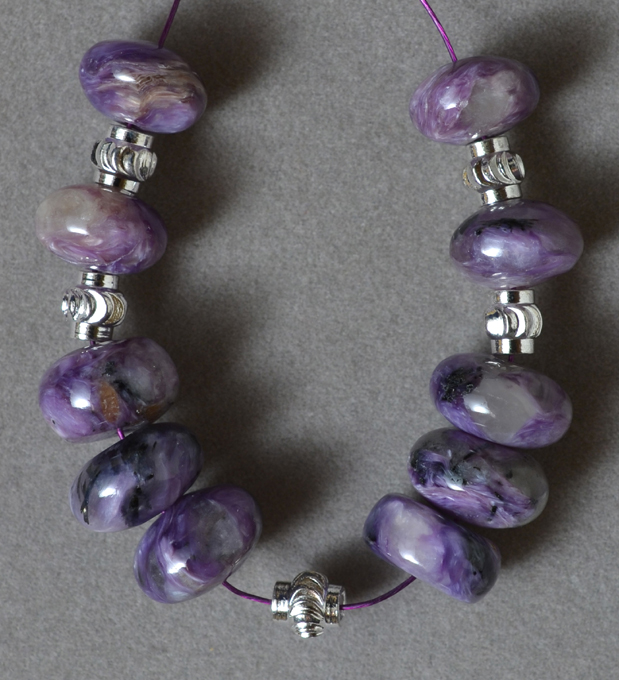 ![]() Supersize Two sizes of charoite rondelle beads on small strand with silver colored spacers. |