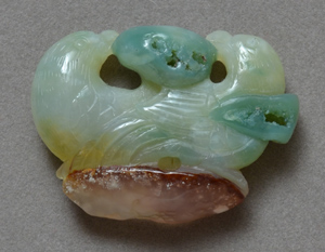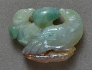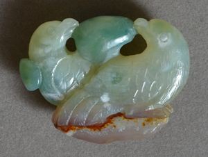 Green chalcedony carved birds with agate base. Hole for stringing is through green orb between birds' heads (not visible in photo.) |