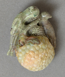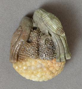 | Carved from spiderweb agate, the birds are very natural grey and brown shades. Hole for stringing as pendant is the gap below where the birds' heads meet. | |