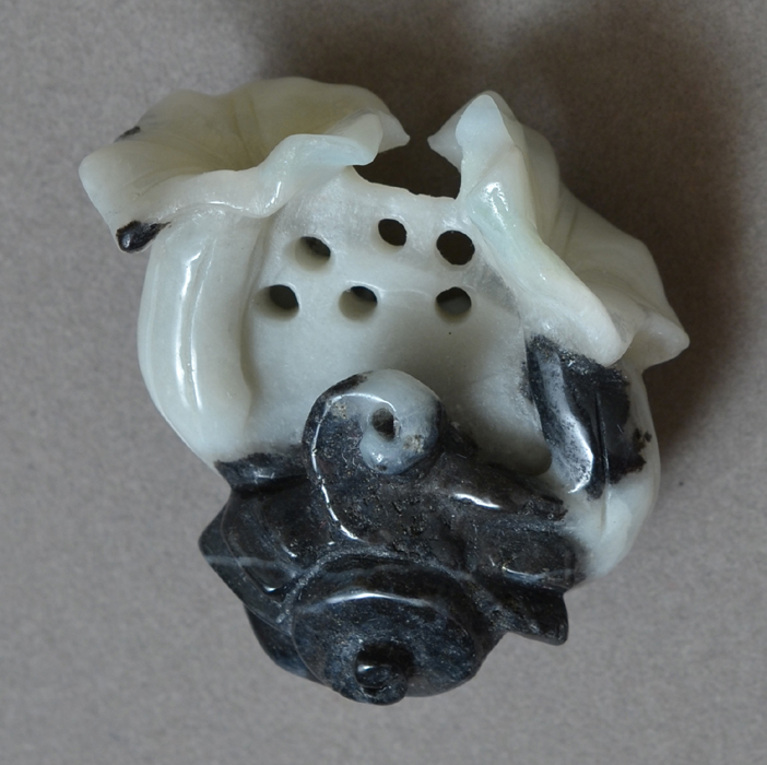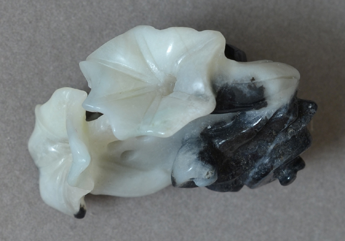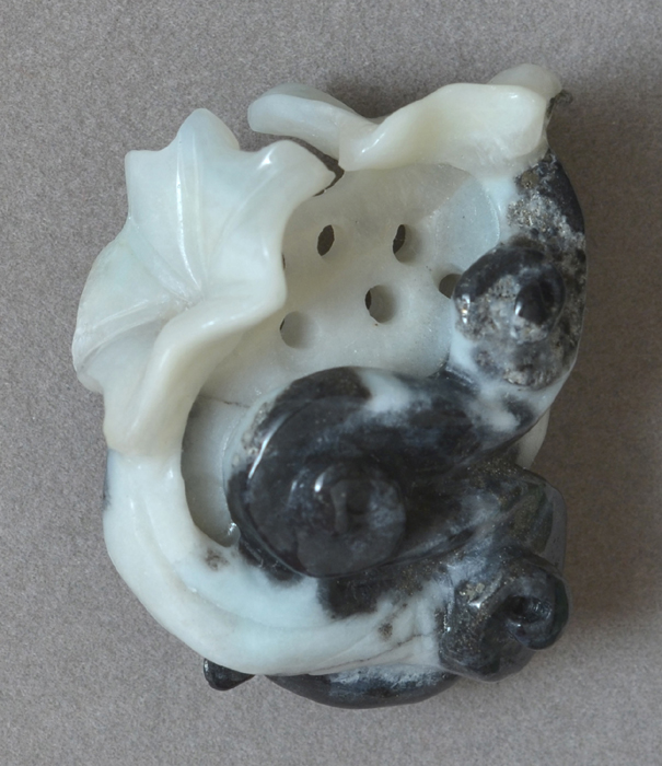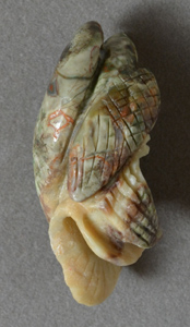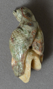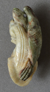 | Like the previous carving, this one is carved from stone with natural bird colors. Hole for stringing is gap below where birds' heads touch. | |