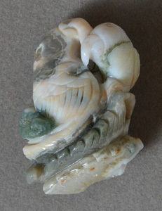 Madagascar ocean jasper carved birds pendant with hole between birds' heads for stringing. |