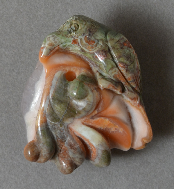 | Multi color agate from Idaho is used in this carving of a single bird on stylized flora. Drill hole for use as a pendant is through the top of the white and clear mass under the bird's beak in the second photo. | |