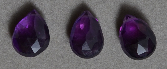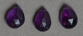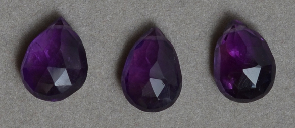 | Three amethyst faceted drop briolette beads of similar size. | |