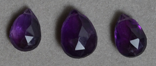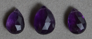 | Three more amethyst faceted drop briolette beads with one larger bead. | |