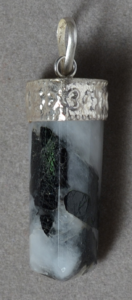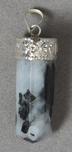 | Himalayan quartz included with tourmaline. Set in silver bale. | |
