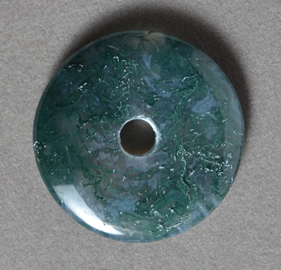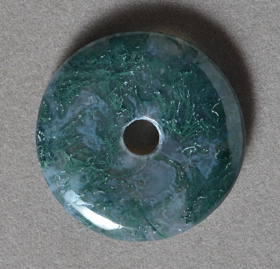 | Mostly green Indian moss agate with some white. Wheel shape is called tai-ky, the Chinese symbol for infinity. | |