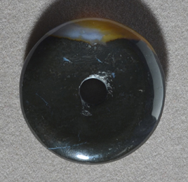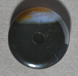 | Slightly concave black, white and orange onyx donut shaped bead. | |