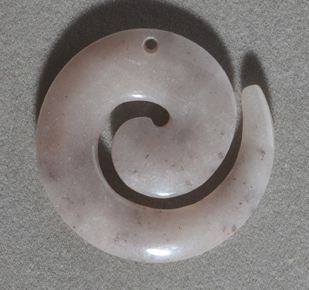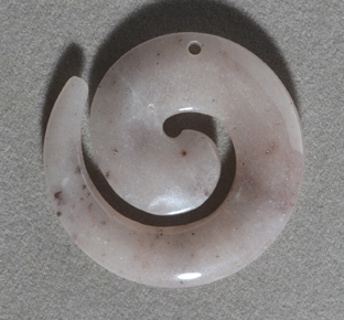 | Spiral shaped pendant bead from cloudy included white chalcedony with very slight rose tint. | |