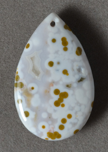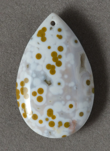 | Teardrop shaped pendant bead from white ocean jasper with brown spots. | |