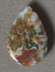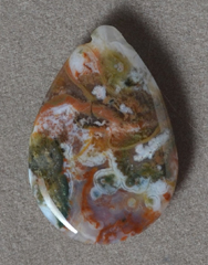 | Ocean jasper teardrop shaped pendant bead with red, green and light blue swirls. | |