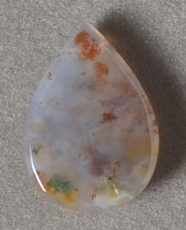 | Grey blue with red, green and yellow ocean agate. Drilled left to right at top in photo. | |