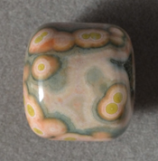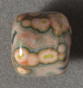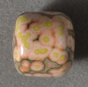 Short rounded drum bead from green, pink and tan ocean jasper. |