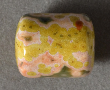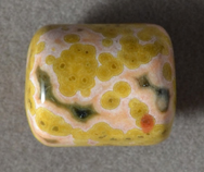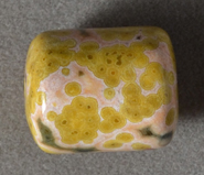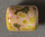 | Rounded ocean jasper drum bead with yellow green, green and pink colors. | |
