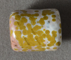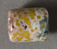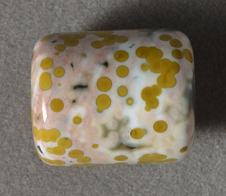 Larger rounded drum bead from yellow green, blue green, pink and white ocean jasper. |