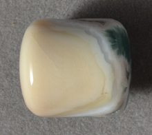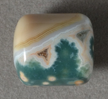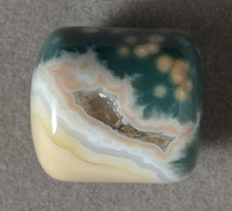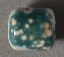 | Another rounded drum bead from ocean jasper. This one is blue green and tan. Small areas of druzy can be seen. | |