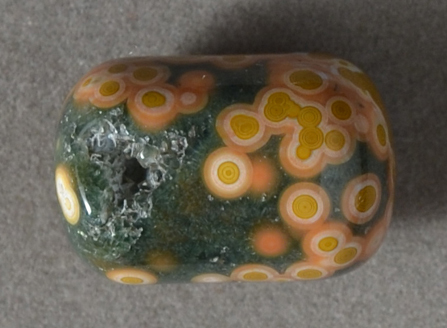 Green, salmon, white and yellow ocean jasper rounded drum bead. Druzy cave seen in first photo. |