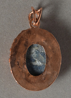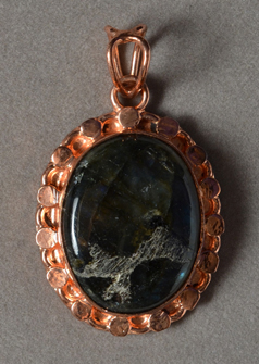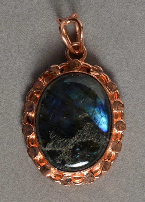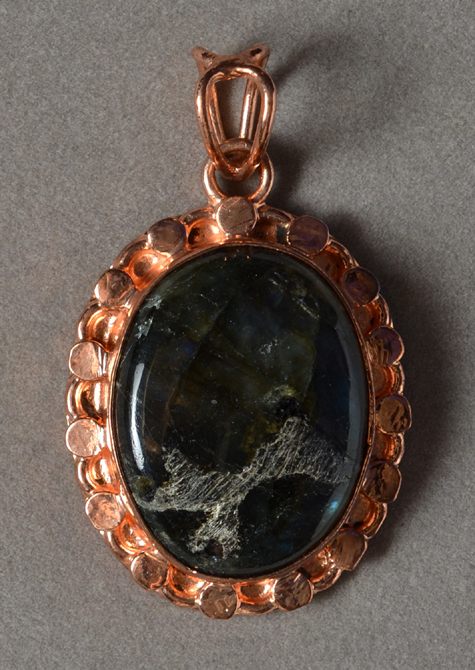 Labradorite/copper pendant Catalog 8365 1 pendant 30 x 22 x 6mm stone 36 x 30 x 9mm with bezel 82 total carats $9 |