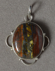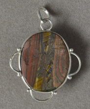 | Called \"tiger iron\" the cabochon in this pendant appears to have a small amount of chatoyant tiger eye in jasper. It looks like wood. | |