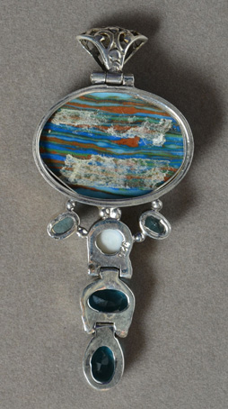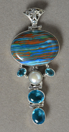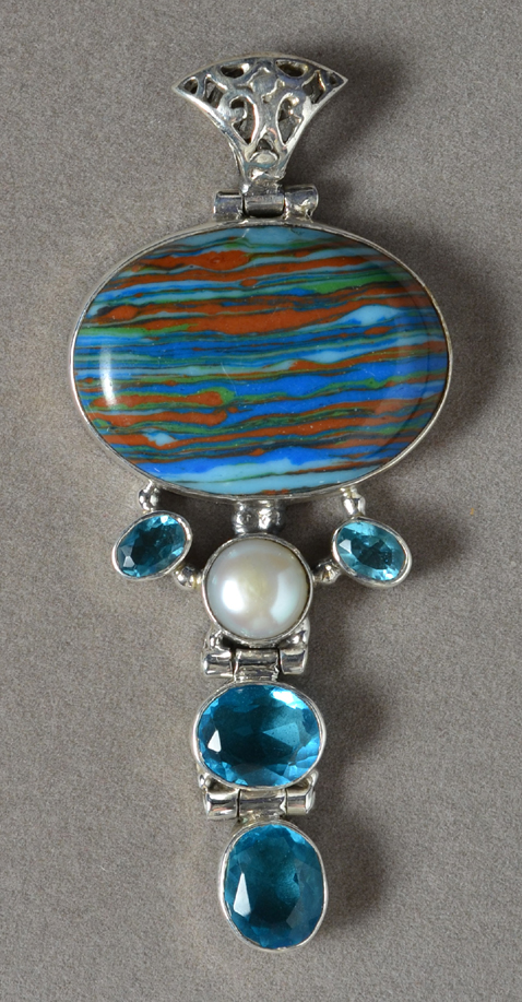 This is a large pendant with a rainbow calcite cabochon, blue topaz and pearl accents. Bale is .925 sterling silver. Made in Germany. |