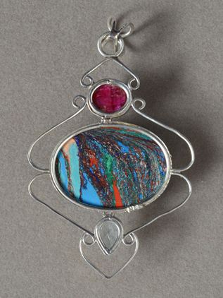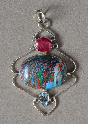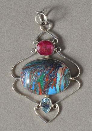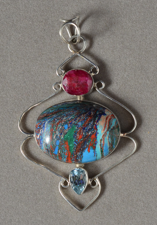 Pendant with a rainbow calcite centerpiece, Indian ruby and blue toaz accent stones. Bale is .925 sterling silver |