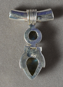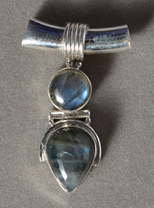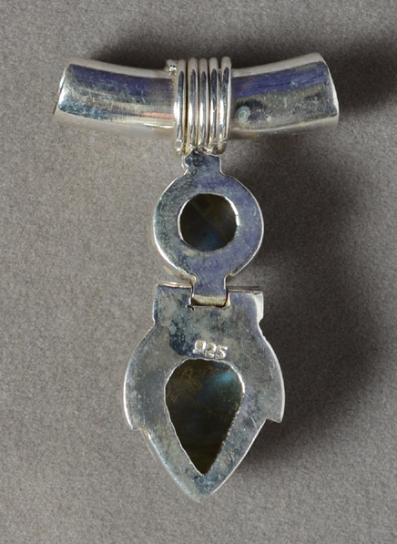 | Pendant with labradorite round and teardrop cabochons and hinged sterling silver bale. | |