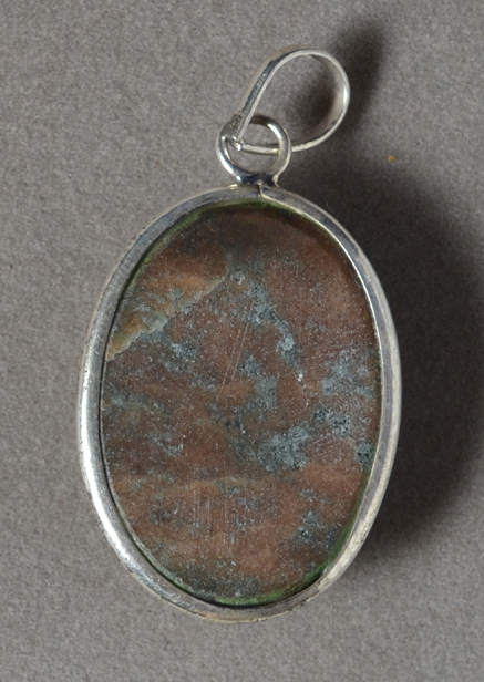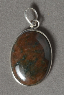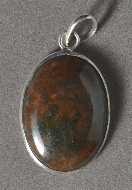 Brown and dark green jasper pendant with sterling silver bale. In bright light there are some sparkly inclusions. |
