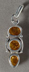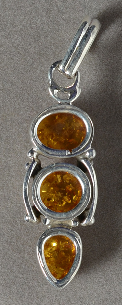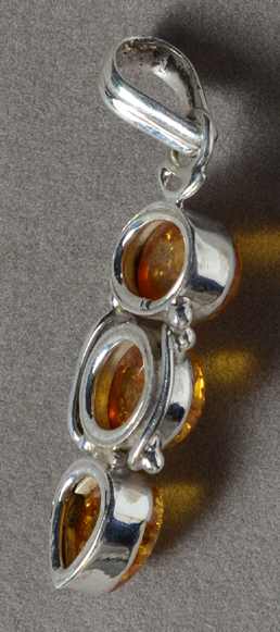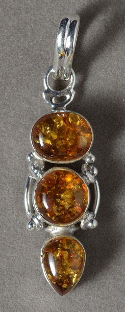 Amber/sterling pendant Catalog 8382 1 pendant 11 x 8 x 5mm top cabochon 47mm total height 26.5 carats $18 |