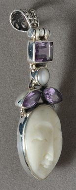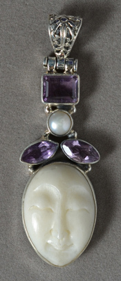 A serene carved bone face highlights this pendant with amethyst accent stones and a small pearl. Bale is hinged and .925 sterling silver. |
