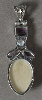 Bone/amethyst/pearl pendant Catalog 8384 1 pendant 26 x 18 x 6mm face 64mm total height 52.5 carats $32 |