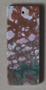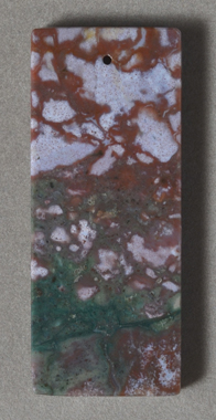 | Large green, red and purple or blue agate rectangle pendant bead weighing almost an ounce. | |
