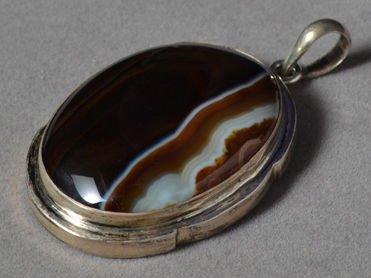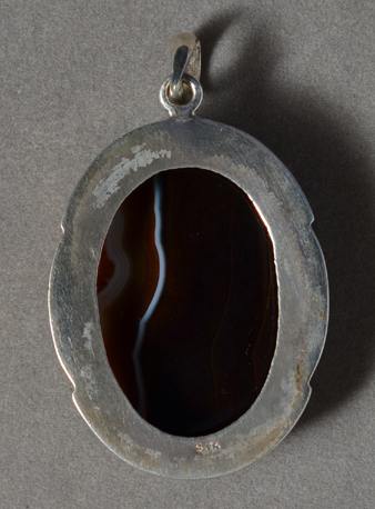 Brown and white agate pedant with sterling silver setting and bale. Tarnish in picture can be removed with polishing. |