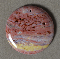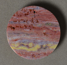 | Flat round pendant bead from pink, blue and yellow Madagascar ocean jasper. | |