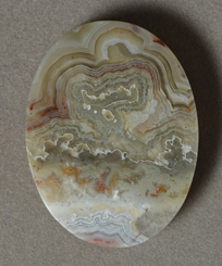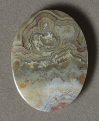 | Flat oval pendant bead from Mexican crazy lace agate. Drilled left to right at top in photo. | |