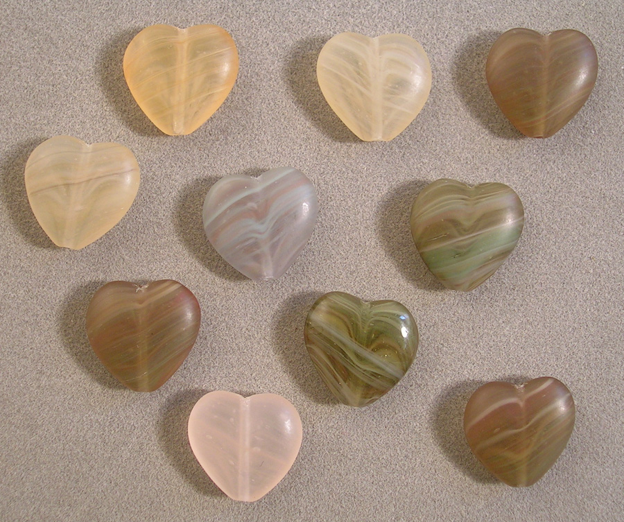 ![]() Supersize 10 glass swirly colored hearts drilled vertically. One plain and nine matt. |
