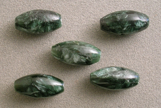 Seraphinite tapered barrel beads Catalog 6379 5 beads 16 x 8mm 38 carats $20(SOLD) |