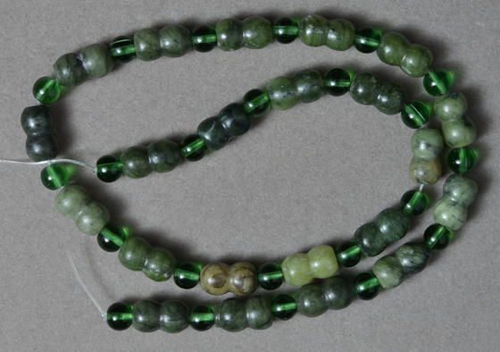 ![]() Supersize Peanut shape serpentine beads with green glass round beads. |
