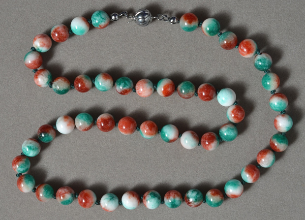 ![]() Supersize Red, white and blue green jadeite round beads necklace on knotted green cord. Clasps are a little difficult to use without help. |