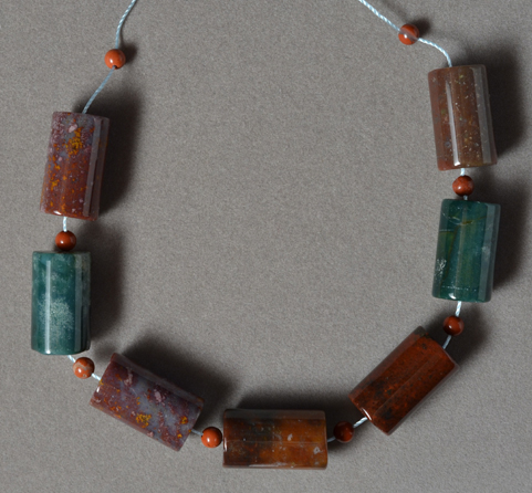 ![]() Supersize Seven green, white, grey, gold, red and brown agate drum beads from agate mined in the U.S. |