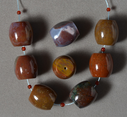 ![]() Supersize Red, brown, gold, blue, white and green agate mined in the U.S. Large wide barrel beads. |