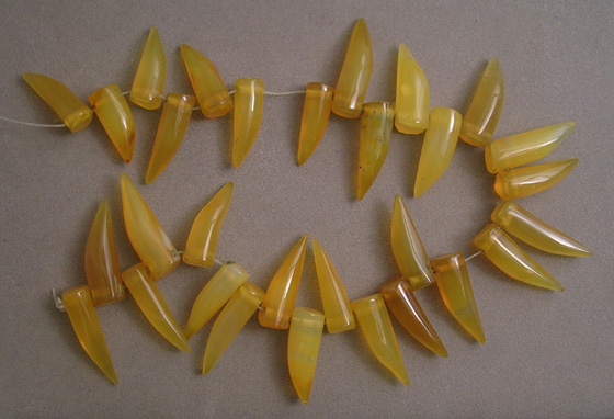 Supersize These nicely colored tooth shaped beads are labeled "yellow agate" by the supplier but they lack banding and we think they could be more acuratedly called opal chalcedony.