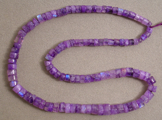 Supersize Heshi cut moonstone beads which have been dyed purple and are graduated sizes.