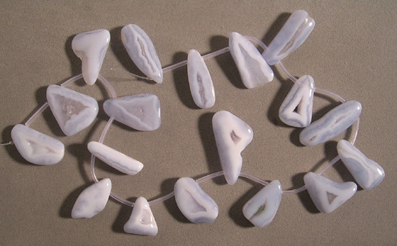 These blue chalceodony beads could be described as flat nuggets or freeform. The blue chalcedony surrounds a geode type area with druzy, white agate and clear opal. They are cross sections of small geodes.