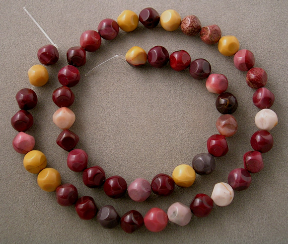 Diagonally drilled rounded mookaite cube beads Catalog 1443 16 in. 7mm 165 ct. $15(SOLD) |